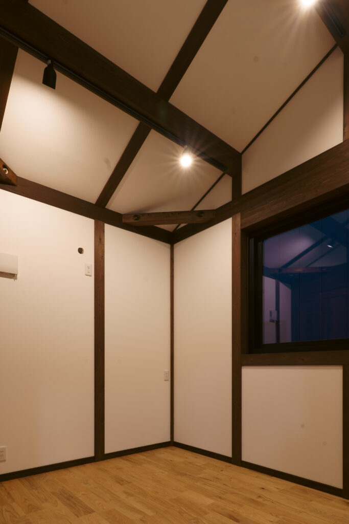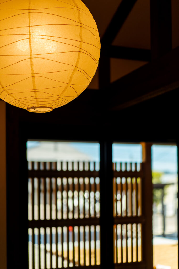 勾配天井から下がる和のライトが空間を穏やかに照らします。