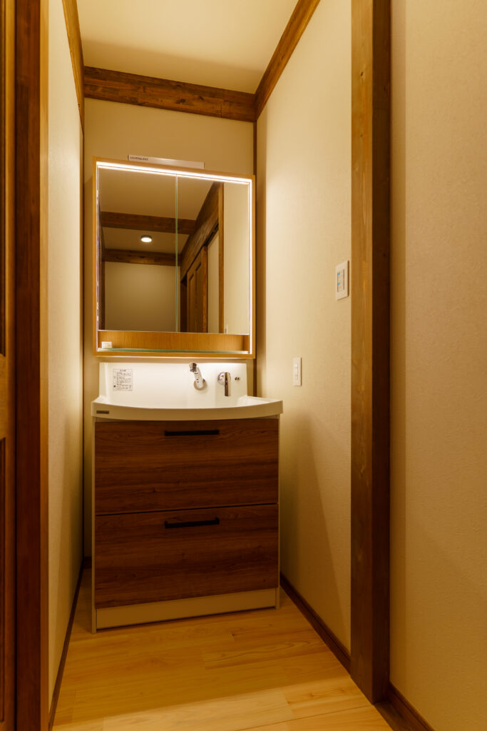 洗面台は上部にご夫婦が一目惚れしたIKEAの照明付きミラーを設置。