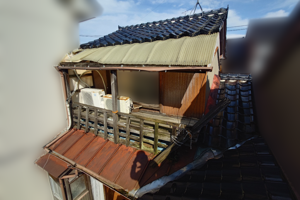 しかし、バルコニーだけを壊すにしても、エアコンの室外機が2つおいてあることや、軒先瓦を撤去してポリカ波板を差し込んであることから、単純にバルコニーの構造部を撤去するだけではなく、電気屋さんや瓦屋さんによる復旧作業も必要となることから、通常の木部解体に比べるとちょっと割高になりそうです。